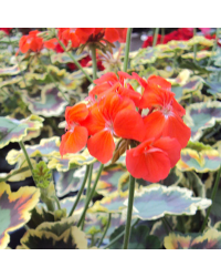Le Géranium zonal Panaché Mrs Pollock rouge de la famille des Géraniacées et sans doute le plus populaire des Genres de Pélargoniums. Originaire d'afrique centrale, Le Géranium zonale est un Géranium qui reste droit et très florifère avec ses nombreux coloris (Blanc, rose,rouge, violet, crème, bicolore, orange, ' ), vous êtes sur d'en trouver un à votre image. Ce Géranium aux fleurs rouges, possède un feuillage panaché jaune et vert-orangé. Il fleurit de début mai jusqu'aux premières gelées d'octobre.