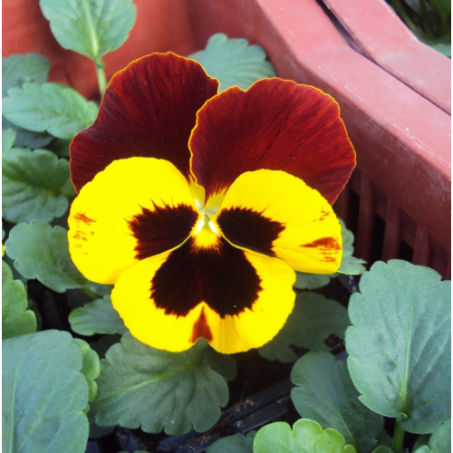 Pensées Matrix rouge et jaune à macule noir et à coeur jaune, idéal pour des massifs ensoleillés ou mi-ombragé.