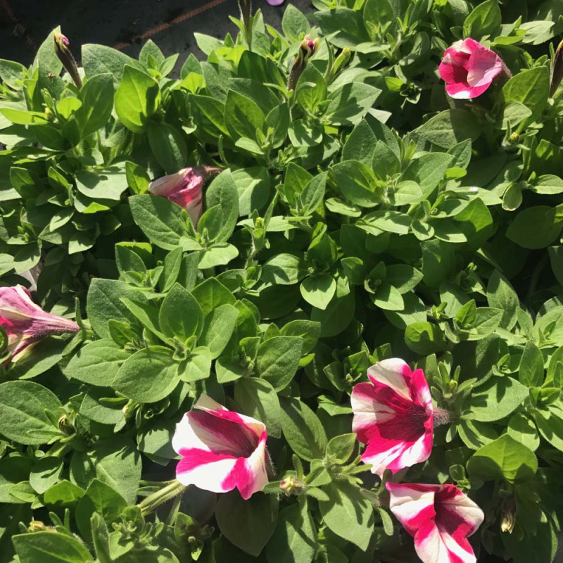 Lors de la plantation, ne collez pas trop les plantes les unes aux autres, de manière à ce que l'air puisse circuler et éviter certaines maladies cryptogamiques comme l'oidium ou la rouille. Sinon le Surfinia ou Pétunia est une plante solide, mais n'oubliez pas de les arroser.