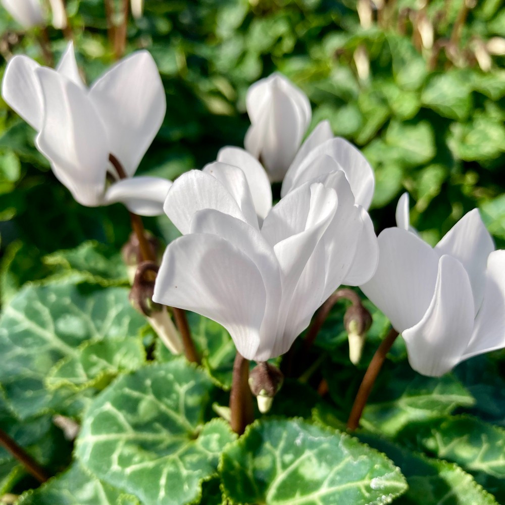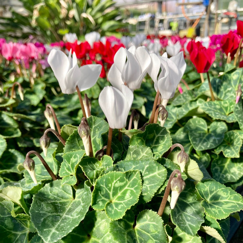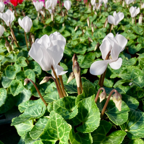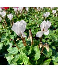 Le Cyclamen blanc, est originaire de L'Asie, L'Europe et L'Italie. Il possède de magnifiques fleurs de couleur Blanc, sa longue floraison se passe aux mois de Janvier, Février, Août, Septembre, Octobre, Novembre, Décembre, son feuillage est Vert, son exposition est plutôt Mi-ombragé. La plantation du Cyclamen blanc peut se faire en Bac, Pot, Pleine Terre, Massif, Bordure. Pour une meilleure reprise de vos végétaux, privilégiez un sol plutôt drainé et argileux. Pour un résultat optimum et plus rapide, il est conseillé pour cette plante de planter 4 à 6pieds/m2, sa croissance est plutôt rapide. La résistance au froid du Cyclamen blanc est d'environ -3°C. À l'Automne, n'hésitez pas à le tailler d'un tiers environ. En cas de fortes gelées, il faudra le couvrir avec un voile d'hivernage.