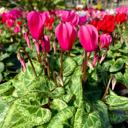 Le Cyclamen violet, est originaire de L'Asie, L'Europe et L'Italie. Il possède de magnifiques fleurs de couleur Violet, sa longue floraison se passe aux mois de Janvier, Février, Août, Septembre, Octobre, Novembre, Décembre, son feuillage est Vert, son exposition est plutôt Mi-ombragé. La plantation du Cyclamen violet peut se faire en Bac, Pot, Pleine Terre, Massif, Bordure. Pour une meilleure reprise de vos végétaux, privilégiez un sol plutôt drainé et argileux. Pour un résultat optimum et plus rapide, il est conseillé pour cette plante de planter 4 à 6pieds/m2, sa croissance est plutôt rapide. La résistance au froid du Cyclamen violet est d'environ -3°C. À l'Automne, n'hésitez pas à le tailler d'un tiers environ. En cas de fortes gelées, il faudra le couvrir avec un voile d'hivernage.