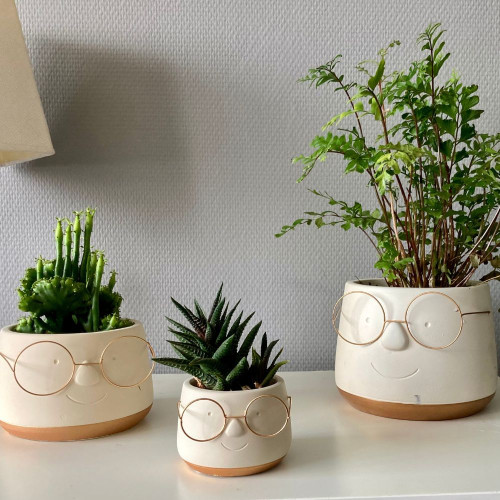 Ce joli pot de fleurs avec visage et lunettes dorées ajoute une touche ludique et élégante à votre décoration intérieure. Avec ses détails dorés et son fond doré, ce pot en terre cuite est à la fois charmant et fonctionnel, parfait pour mettre en valeur vos plantes préférées.